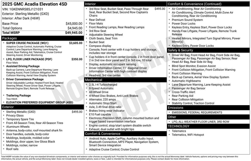 2025 GMC Acadia Elevation RETIRED DEMO SAVINGS!!!, Acadia Elevation, 2.5L DOHC, AWD, Sterling Metallic, After Dark Cloth, 1st & 2nd Row All-Weather Floor Liner (LPO), 3 Years of OnStar Digital Services, 3rd Row All-Weather Floor Liner (LPO), Driver Attention Assist, Enhanced Automatic Parking Assist, Floor Liner Package (LPO), Navigation System, Preferred Equipment Group 4SD, Super Cruise, Super Cruise Package.