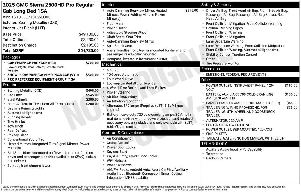 2025 GMC Sierra 2500HD Pro Sierra 2500HD Pro, 2D Standard Cab, 6.6L V8, 10-Speed Automatic, 4WD, Sterling Metallic, Black Cloth, 2 Charge/Data USB Ports, 2-Speed Electronic Shift Transfer Case, 220-Amp Alternator, Chrome Grille w/Flat Black Grille Insert Bars, Convenience Package, Deep-Tinted Glass, Electric Rear-Window Defogger, EZ Lift Power Lock & Release Tailgate, LED Cargo Area Lighting, OnStar Services Capable, Preferred Equipment Group 1SA, Push Button Start, Remote Keyless Entry, Snow Plow Prep/Camper Package, Solar Absorbing Tinted Glass, Suspension Package, Wireless Phone Projection.