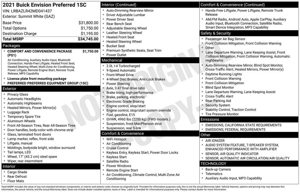 This well-equipped 2021 Buick Envision Preferred represents an exceptional value, offering a wealth of premium features and a refined driving experience. We invite you to visit our showroom and experience this remarkable crossover for yourself. Let us demonstrate how the Envision Preferred can exceed your expectations and become the perfect addition to your lifestyle.