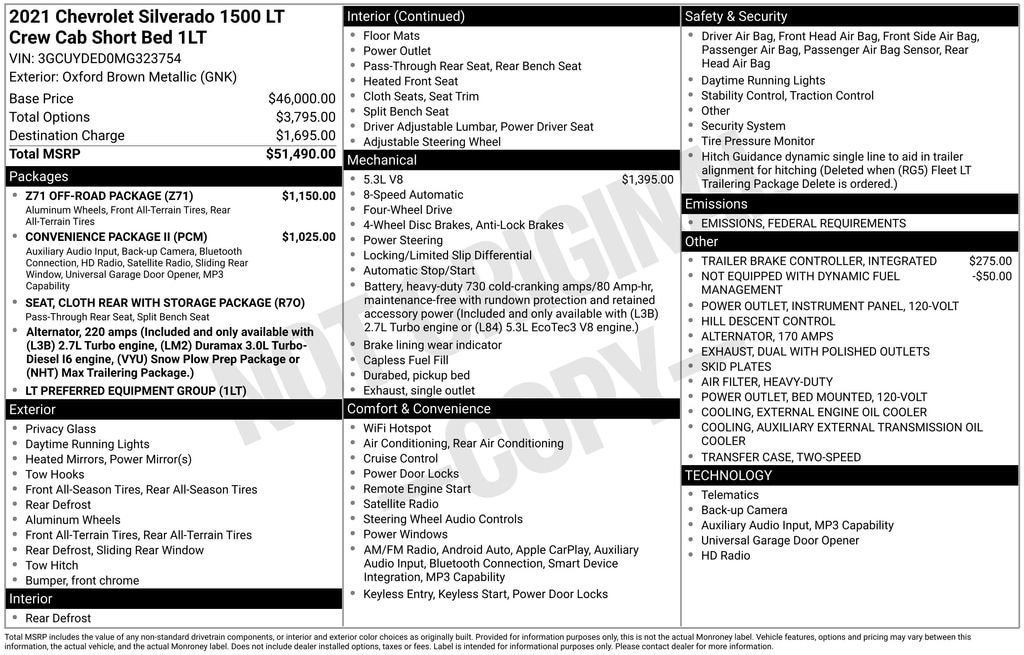 CARFAX One-Owner. Clean CARFAX. Silverado 1500 LT LT1, 4D Crew Cab, EcoTec3 5.3L V8, 8-Speed Automatic, 4WD, Oxford Brown Metallic, Black Cloth, 10-Way Power Driver Seat w/Lumbar, 12-Volt Rear Auxiliary Power Outlet, 120-Volt Bed Mounted Power Outlet, 120-Volt Instrument Panel Power Outlet, 2 USB Ports, 2 USB Ports (First Row), 4.2 Diagonal Color Display Driver Info Center, 4G LTE Wi-Fi Hot Spot Capable, All-Star Edition, Auto-Locking Rear Differential, Bluetooth® For Phone, Chevrolet Connected Access Capable, Chrome Grille, Chrome Mirror Caps, Cloth Rear Seat w/Storage Package, Color-Keyed Carpeting Floor Covering, Compass, Convenience Package, Convenience Package II, Deep-Tinted Glass, Dual Exhaust w/Polished Outlets, Dual-Zone Automatic Climate Control, Electric Rear-Window Defogger, Electrical Lock Control Steering Column, Electronic Cruise Control, EZ Lift Power Lock & Release Tailgate, Front Frame-Mounted Black Recovery Hooks, Front Rubberized Vinyl Floor Mats, HD Radio, HD Rear Vision Camera, Heated Driver & Front Outboard Passenger Seats, Heated Steering Wheel, Heavy-Duty Air Filter, Hill Descent Control, Hitch Guidance, Keyless Open & Start, Leather Wrapped Steering Wheel, LED Cargo Area Lighting, Manual Tilt/Telescoping Steering Column, Off-Road Suspension, OnStar & Chevrolet Connected Services Capable, Power Door Locks, Power Front Windows w/Driver Express Up/Down, Power Front Windows w/Passenger Express Down, Power Rear Windows w/Express Down, Power Sliding Rear Window w/Rear Defogger, Preferred Equipment Group 1LT, Radio: Chevrolet Infotainment 3 Plus System, Rear 60/40 Folding Bench Seat (Folds Up), Rear Dual USB Charging-Only Ports, Rear Rubberized-Vinyl Floor Mats, Rear Vision Camera, Remote Vehicle Starter System, SiriusXM Radio, SiriusXM w/360L, Standard Tailgate, Steering Wheel Audio Controls, Theft Deterrent System (Unauthorized Entry), Trailering Package, Universal Home Remote, Wheels: 18 x 8.5 Bright Silver Painted Aluminum, Wireless Phone Projection, Z71 Off-Road Package.