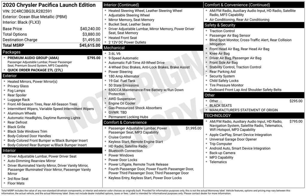 Clean CARFAX. Priced below KBB Fair Purchase Price! Pacifica Launch Edition, 4D Passenger Van, 3.6L V6 24V VVT, 9-Speed 948TE Automatic, AWD, Ocean Blue Metallic, Black Leather, 115V Auxiliary Power Outlet, 13 Alpine Speakers, 220 Amp Alternator, 2nd Row USB Charge Port, 3-Channel Video Remote Control, 3-Channel Wireless Headphones (RF), 3rd Row USB Charge Port, 506 Watt Amplifier, Blu-Ray/DVD Player/USB Port, Front Passenger Auto Advance N Return, GPS Navigation, High Definition Multimedia Interface, Integrated Active Noise Cancellation, Power 8-Way Passenger Seat, Power Passenger Lumbar Adjust, Premium Audio Group, Quick Order Package 27L, Seatback Video Screens, Uconnect Theater w/Streaming, Video USB Port.