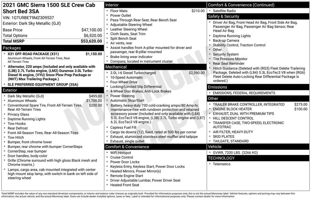 Clean CARFAX. Priced below KBB Fair Purchase Price! Odometer is 26677 miles below market average! Sierra 1500 SLE, 4D Crew Cab, 3.0L I6, 10-Speed Automatic, 4WD, Dark Sky Metallic, Black Cloth, 12-Volt Rear Auxiliary Power Outlet, 220 Amp Alternator, 4G LTE Wi-Fi Hotspot Capable, Auto-Locking Rear Differential, Chrome Grille, Color-Keyed Carpeting Floor Covering, Compass, Deep-Tinted Glass, Dual Exhaust w/Premium Tips, Dual-Zone Automatic Climate Control, Electric Rear-Window Defogger, Electrical Lock Control Steering Column, Front Frame-Mounted Black Recovery Hooks, Front Rubberized-Vinyl Floor Mats, GMC Connected Access Capable, Heated Steering Wheel, Heavy-Duty Air Filter, Hill Descent Control, Hitch Guidance, Keyless Open & Start, LED Cargo Area Lighting, Manual Tilt-Wheel & Telescoping Steering Column, Off-Road Suspension, OnStar & GMC Connected Services Capable, Power Door Locks, Power Front Windows w/Driver Express Up/Down, Power Front Windows w/Passenger Express Down, Power Rear Windows w/Express Down, Preferred Equipment Group 3SA, Rear Dual USB Charging-Only Ports, Rear Rubberized-Vinyl Floor Mats, Rear Wheelhouse Liners, Remote Vehicle Starter System, SLE Convenience Package, SLE Value Package, Snow Plow Prep Package, Steering Wheel Audio Controls, Theft Deterrent System (Unauthorized Entry), Trailering Package, Wheels: 18 x 8.5 6-Spoke Machined Aluminum, X31 Hard Badge, X31 Off-Road Package.