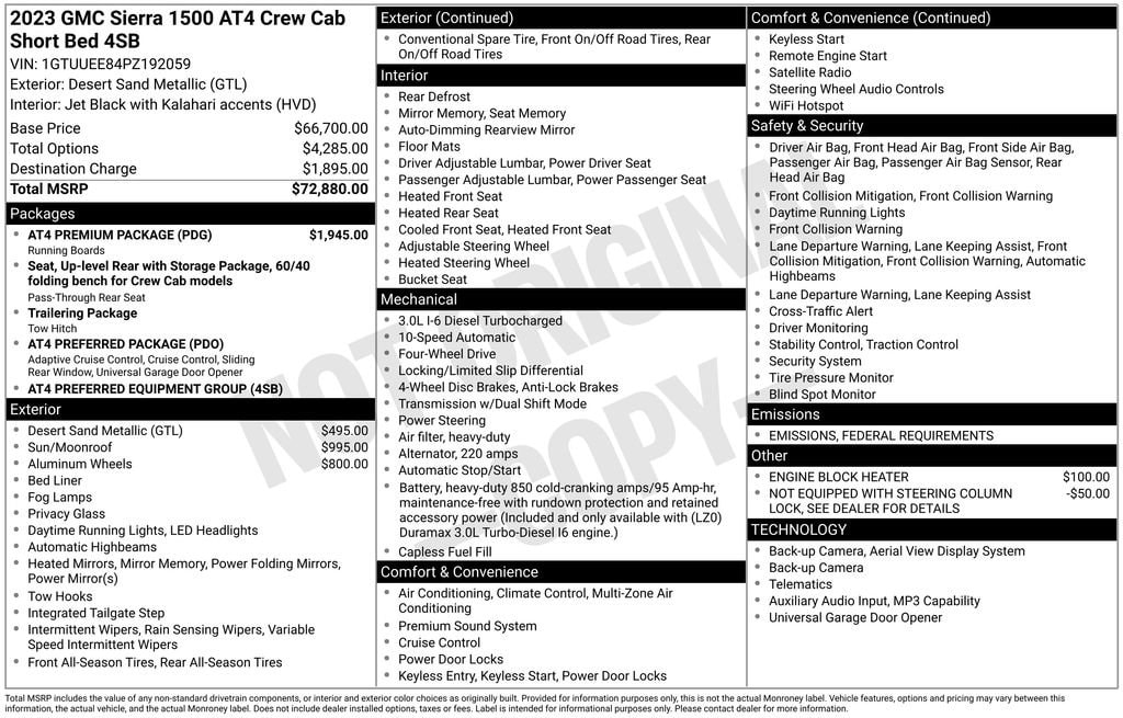 CARFAX One-Owner. Clean CARFAX. Sierra 1500 AT4, 4D Crew Cab, 3.0L I6, 10-Speed Automatic, 4WD, Desert Sand Metallic, Jet Black With Kalahari Accents Leather, 120-Volt Bed Mounted Power Outlet, 120-Volt Instrument Panel Power Outlet, 2 Charge/Data USB Ports Inside Center Console, 2 Type-C Charge-Only Rear USB Ports, 2 USB Ports, 220 Amp Alternator, Adaptive Cruise Control, AT4 Preferred Package, AT4 Premium Package, Auto-Locking Rear Differential, Black Chrome Header & Grille Insert Bars, Color-Keyed Carpeting Floor Covering, Compass, Deep-Tinted Glass, Electric Rear-Window Defogger, Electrical Steering Column Lock, Floor-Mounted Center Console, Front Prem Floor Liners w/Removable Carpet Insert, Front Rainsensing Wipers, GMC Connected Access Capable, HD Surround Vision, Heated 2nd Row Outboard Seats, Heated Driver & Front Outboard Passenger Seating, Heavy-Duty Air Filter, Hill Descent Control, Hitch Guidance, Hitch Guidance w/Hitch View, In-Vehicle Trailering App, Integrated Trailer Brake Controller, Keyless Open & Start, LED Cargo Area Lighting, Navigation System, Off-Road High Clearance Step (LPO), OnStar & GMC Connected Services Capable, Perimeter Lighting, Power Door Locks, Power Front Passenger Windows w/Express Up/Down, Power Front Windows w/Driver Express Up/Down, Power Rake & Telescoping Steering Column, Power Rear Windows w/Express Down, Power Sliding Rear Window w/Rear Defogger, Preferred Equipment Group 4SB, Premium Bose 7-Speaker Sound System, Push Button Start, Rear Cross Traffic Braking, Rear Pedestrian Detection, Rear Prem Floor Liners w/Removable Carpet Insert, Rear Wheelhouse Liners, Red Recovery Hooks, Remote Vehicle Starter System, SiriusXM w/360L, Spray-On Pickup Bed Liner w/AT4 Logo, Steering Wheel Audio Controls, Theft Deterrent System (Unauthorized Entry), Trailer Camera Provisions, Trailer Side Blind Zone Alert, Trailering Package, Ultrasonic Front & Rear Park Assist, Universal Home Remote, Ventilated Driver & Front Passenger Seats, Wi-Fi Hotspot Capable, Wireless Charging, Wireless Phone Projection.