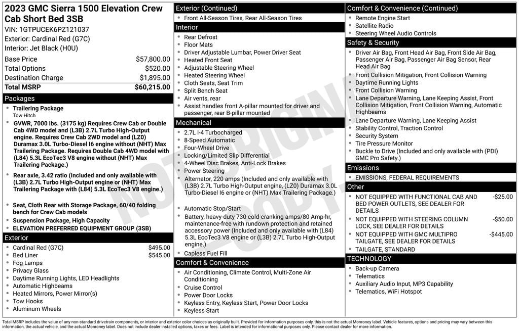 CARFAX One-Owner. Priced below KBB Fair Purchase Price! Sierra 1500 Elevation, 4D Crew Cab, 2.7L I4 Turbocharged DOHC 16V LEV3-ULEV50 310hp, 8-Speed Automatic, 4WD, Cardinal Red, Black Cloth, 120-Volt Bed Mounted Power Outlet, 120-Volt Instrument Panel Power Outlet, 2 Charge/Data USB Ports, 2 Type-C Charge-Only Rear USB Ports, 6-Speaker Audio System Feature, Auto-Locking Rear Differential, Body Color Header w/Gloss Black Mesh Grille Bars, Cloth Rear Seat w/Storage Package, Color-Keyed Carpeting Floor Covering, Compass, Deep-Tinted Glass, Electric Rear-Window Defogger, Electrical Steering Column Lock, Front Frame-Mounted Black Recovery Hooks, Front Rubberized-Vinyl Floor Mats, GMC Connected Access Capable, HD Rear Vision Camera, High Capacity Suspension Package, Hitch Guidance, Keyless Open & Start, LED Cargo Area Lighting, Manual Tilt-Wheel & Telescoping Steering Column, OnStar & GMC Connected Services Capable, Power Door Locks, Power Front Windows w/Driver Express Up/Down, Power Front Windows w/Passenger Express Down, Power Rear Windows w/Express Down, Preferred Equipment Group 3SB, Push Button Start, Rear Rubberized-Vinyl Floor Mats, Remote Vehicle Starter System, SiriusXM w/360L, Steering Wheel Audio Controls, Theft Deterrent System (Unauthorized Entry), Trailering Package, Wi-Fi Hotspot Capable, Wireless Phone Projection.