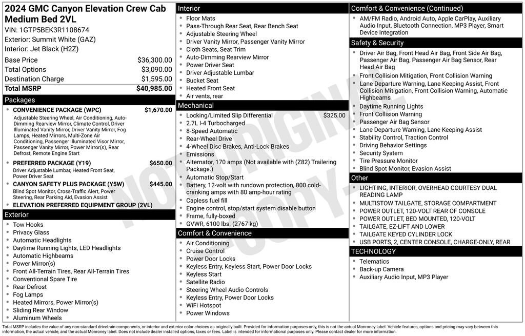 Discover the ultimate driving experience with the 2024 GMC Canyon Elevation. This dynamic midsize truck combines exceptional capability, advanced technology, and refined style to elevate your everyday adventures.Boasting an impressive array of premium features, the Canyon Elevation is designed to exceed your expectations. Key highlights include: Convenience Package Preferred Package Canyon Safety Plus Package Automatic Locking Rear Differential Navigation System Dual-Zone Automatic Air Conditioning Rear-Window Electric Defogger 120-Volt Bed Mounted Power Outlet 8-Way Power Driver Seat Adjuster Remote Vehicle Starter System Tilt & Telescopic Manual Steering Column Automatic Emergency Braking Front Pedestrian & Bicyclist Braking Ultrasonic Rear Park Assist EZ-Lift & Lower TailgatePowered by a potent 2.7L I4 Turbocharged engine delivering 310 horsepower, the Canyon Elevation seamlessly blends performance and efficiency, achieving an impressive 19 MPG in the city and 23 MPG on the highway. This truck's rugged yet refined exterior, complete with LED fog lamps and a MultiStow tailgate, commands attention wherever you go.Step inside the spacious cabin and experience the ultimate in comfort and convenience. Heated front seats, a power-adjustable driver's seat, and dual-zone climate control ensure you and your passengers travel in complete luxury. Stay connected with the premium GMC Infotainment System, featuring wireless Apple CarPlay and Android Auto integration.The Canyon Elevation's advanced safety suite, including Blind Zone Steering Assist, Rear Cross Traffic Braking, and Rear Park Assist, provides you with the confidence to tackle any road or trail. And with the available ProGrade Trailering System, you can tow with ease, knowing your vehicle has your back.Whether you're tackling your daily commute or embarking on an outdoor adventure, the 2024 GMC Canyon Elevation is the perfect companion. Experience the perfect blend of capability, technology, and style visit our showroom today and discover the difference for yourself.
