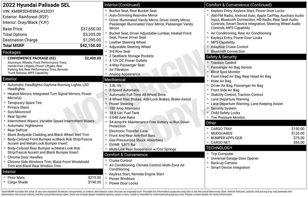 Odometer is 9722 miles below market average! Palisade SEL, 4D Sport Utility, V6, 8-Speed Automatic with SHIFTRONIC, AWD, Rainforest, Gray/Black Cloth, 115-Volt AC Power Outlet, 3rd Row USB Outlets, 7 High-Resolution Cluster Display, Acoustic Front Side Glass, Auto Leveling Rear Suspension, Convenience Package, Convenience Package P2, Front Parking Sensors, Hands-Free Smart Liftgate, LED Taillights, Rear Side Window Sunshades, Ultrasonic Rear Occupant Alert, Wheels: 20 x 7.5J Split 5-Spoke Machined Alloy, Wireless Phone Charger.