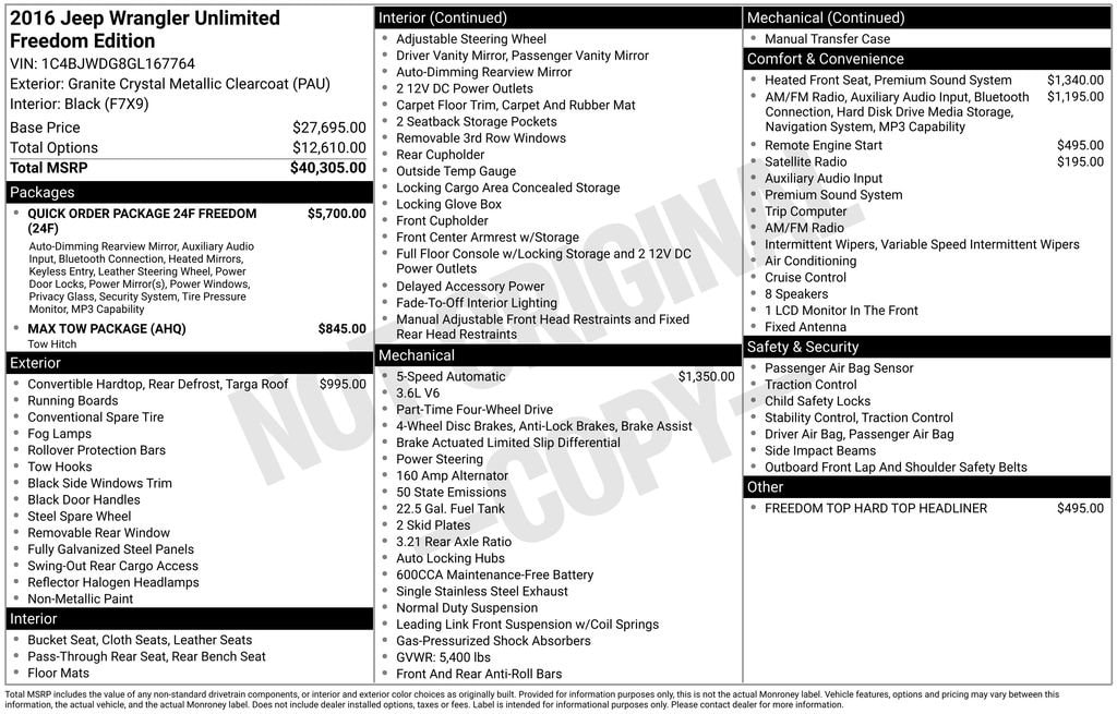 2016 Jeep Wrangler Unlimited Freedom EditionOdometer is 19660 miles below market average! Wrangler Unlimited Freedom Edition, 4D Sport Utility, 3.6L V6 24V VVT, 5-Speed Automatic, 4WD, Granite Crystal Metallic Clearcoat, Black Leather, Auto-Dimming Mirror w/Reading Lamp, Black/Chrome Screws Fuel Filler Door, Body Color Fender Flares, Class II Receiver Hitch, Connectivity Group, Deep Tint Sunscreen Windows, Driver Height Adjuster Seat, Freedom Edition Badging, Freedom Package Decals, Front 1-Touch Down Power Windows, GPS Navigation, Granite Crystal Jeep Badge, Iron Gray Interior Accents, Leather Seat w/Cloth (Sedoso Fabric) (DISC), Low Gloss Black Wrangler Decal, Max Tow Package, Mid Gloss Granite Crystal Appliques, Mid Gloss Granite Crystal Grille, MOPAR Black Tail Lamp Guards, MOPAR Coat Hooks and Grab Handles, MOPAR Slush Mats, Oscar Mike Badge, Pantone Trail Rated Badge, Power Convenience Group, Power Heated Mirrors, Power Locks, Premium Black Sunrider Soft Top, Quick Order Package 24F Freedom (DISC), Remote Keyless Entry, Remote USB Port, Security Alarm, Silver Interior Accents, Sunrider Soft Top, Tire Pressure Monitoring Display, Trailer Tow w/4-Pin Connector Wiring, Tubular Side Steps, Uconnect Voice Command w/Bluetooth, Vehicle Information Center, Wheels: 17 x 7.5 5-Spoke Aluminum (DISC).Groulx Automotive is a Third Generation dealership in Monroe Michigan. We have been proudly serving our community since 1956.